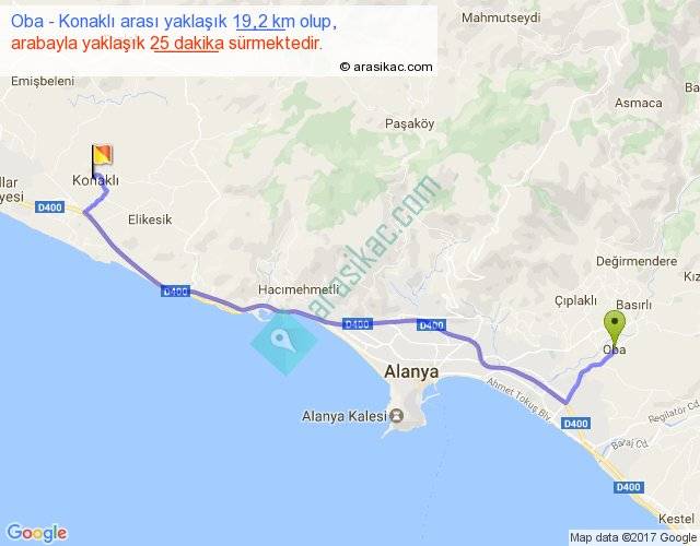 Oba - Konaklı arası yaklaşık olarak 90 km/h ile yukarıda belirtilen sürede olup, iki yerin kuş uçuşu uzaklığı (mesafesi) 15'dir. Yolculuk otobüsle 32 dakika sürmektedir.