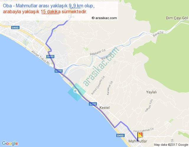 Oba - Mahmutlar arası yaklaşık olarak 90 km/h ile yukarıda belirtilen sürede olup, iki yerin kuş uçuşu uzaklığı (mesafesi) 7'dir. Yolculuk otobüsle 20 dakika sürmektedir.