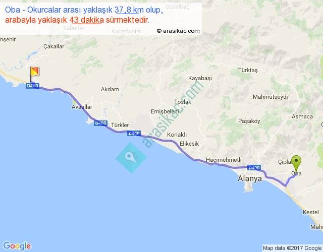 Oba - Okurcalar arası yaklaşık olarak 90 km/h ile yukarıda belirtilen sürede olup, iki yerin kuş uçuşu uzaklığı (mesafesi) 34'dir. Yolculuk otobüsle 55 dakika sürmektedir.