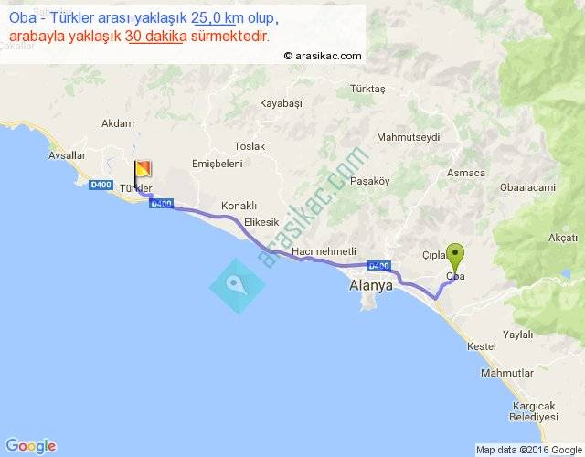 Oba - Türkler arası yaklaşık olarak 90 km/h ile yukarıda belirtilen sürede olup, iki yerin kuş uçuşu uzaklığı (mesafesi) 22'dir. Yolculuk otobüsle 39 dakika sürmektedir.