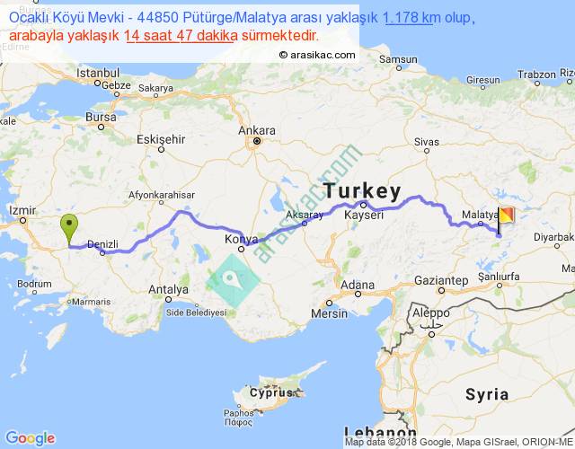 Ocaklı Köyü Mevki - 44850 Pütürge Malatya arası yaklaşık olarak 90 km/h ile yukarıda belirtilen sürede olup, iki yerin kuş uçuşu uzaklığı (mesafesi) 915'dir. Eğer belirtilen yerler arasında uçak seferi var ise bu süre uçakla 1 saat 24 dakika'ya kadar düşebilir. Yolculuk otobüsle 19 saat 13 dakika sürmektedir.