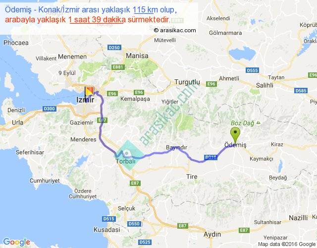 Ödemiş - Konak İzmir arası yaklaşık olarak 90 km/h ile yukarıda belirtilen sürede olup, iki yerin kuş uçuşu uzaklığı (mesafesi) 75'dir. Yolculuk otobüsle 2 saat 8 dakika sürmektedir.
