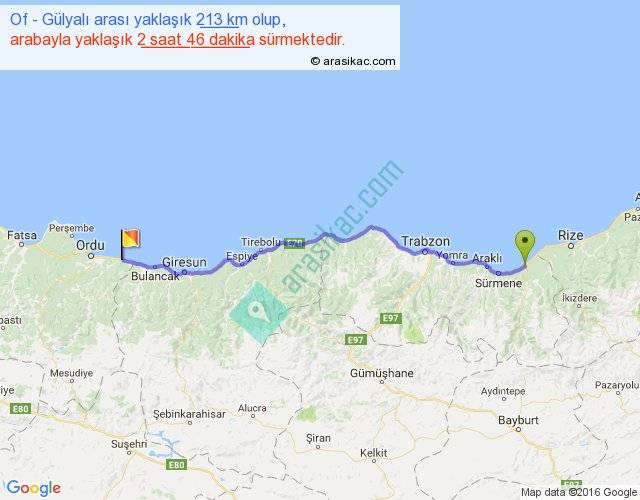 Of - Gülyalı arası yaklaşık olarak 90 km/h ile yukarıda belirtilen sürede olup, iki yerin kuş uçuşu uzaklığı (mesafesi) 184'dir. Yolculuk otobüsle 3 saat 35 dakika sürmektedir.