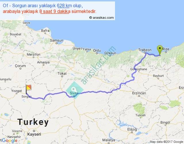 Of - Sorgun arası yaklaşık olarak 90 km/h ile yukarıda belirtilen sürede olup, iki yerin kuş uçuşu uzaklığı (mesafesi) 447'dir. Eğer belirtilen yerler arasında uçak seferi var ise bu süre uçakla 41 dakika'ya kadar düşebilir. Yolculuk otobüsle 10 saat 35 dakika sürmektedir.