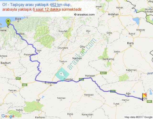 Of - Taşlıçay arası yaklaşık olarak 90 km/h ile yukarıda belirtilen sürede olup, iki yerin kuş uçuşu uzaklığı (mesafesi) 297'dir. Eğer belirtilen yerler arasında uçak seferi var ise bu süre uçakla 27 dakika'ya kadar düşebilir. Yolculuk otobüsle 8 saat 3 dakika sürmektedir.