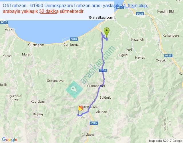 Of Trabzon - 61950 Dernekpazarı Trabzon arası yaklaşık olarak 90 km/h ile yukarıda belirtilen sürede olup, iki yerin kuş uçuşu uzaklığı (mesafesi) 16'dir. Yolculuk otobüsle 41 dakika sürmektedir.