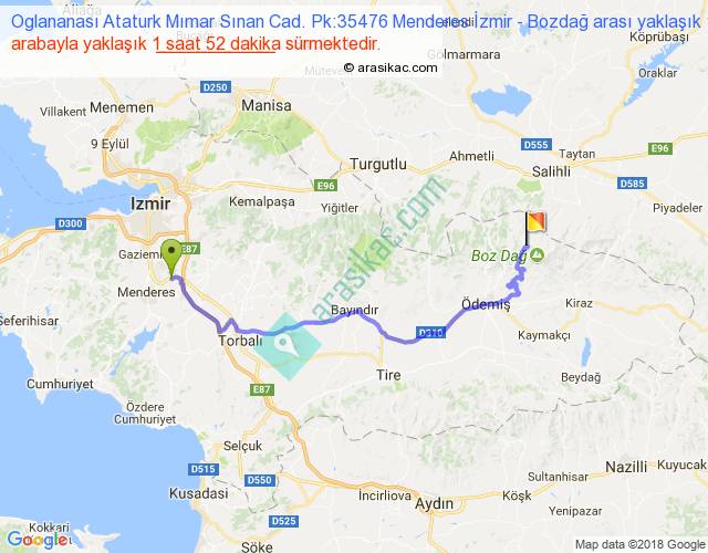 Oglananası Ataturk Mımar Sınan Cad. Pk:35476 Menderes İzmir - Bozdağ arası yaklaşık olarak 90 km/h ile yukarıda belirtilen sürede olup, iki yerin kuş uçuşu uzaklığı (mesafesi) 77'dir. Yolculuk otobüsle 2 saat 25 dakika sürmektedir.