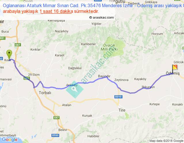 Oglananası Ataturk Mımar Sınan Cad. Pk:35476 Menderes İzmir - Ödemiş arası yaklaşık olarak 90 km/h ile yukarıda belirtilen sürede olup, iki yerin kuş uçuşu uzaklığı (mesafesi) 68'dir. Yolculuk otobüsle 1 saat 38 dakika sürmektedir.