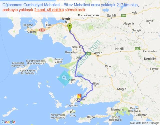 Oğlananası Cumhuriyet Mahallesi - Bitez Mahallesi arası yaklaşık olarak 90 km/h ile yukarıda belirtilen sürede olup, iki yerin kuş uçuşu uzaklığı (mesafesi) 134'dir. Yolculuk otobüsle 3 saat 39 dakika sürmektedir.