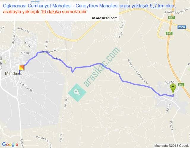 Oğlananası Cumhuriyet Mahallesi - Cüneytbey Mahallesi arası yaklaşık olarak 90 km/h ile yukarıda belirtilen sürede olup, iki yerin kuş uçuşu uzaklığı (mesafesi) 8'dir. Yolculuk otobüsle 20 dakika sürmektedir.