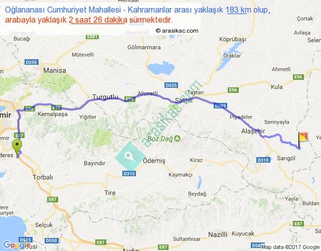 Oğlananası Cumhuriyet Mahallesi - Kahramanlar arası yaklaşık olarak 90 km/h ile yukarıda belirtilen sürede olup, iki yerin kuş uçuşu uzaklığı (mesafesi) 134'dir. Yolculuk otobüsle 3 saat 9 dakika sürmektedir.
