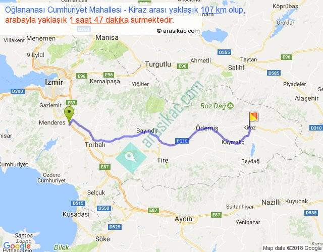 Oğlananası Cumhuriyet Mahallesi - Kiraz arası yaklaşık olarak 90 km/h ile yukarıda belirtilen sürede olup, iki yerin kuş uçuşu uzaklığı (mesafesi) 85'dir. Yolculuk otobüsle 2 saat 19 dakika sürmektedir.