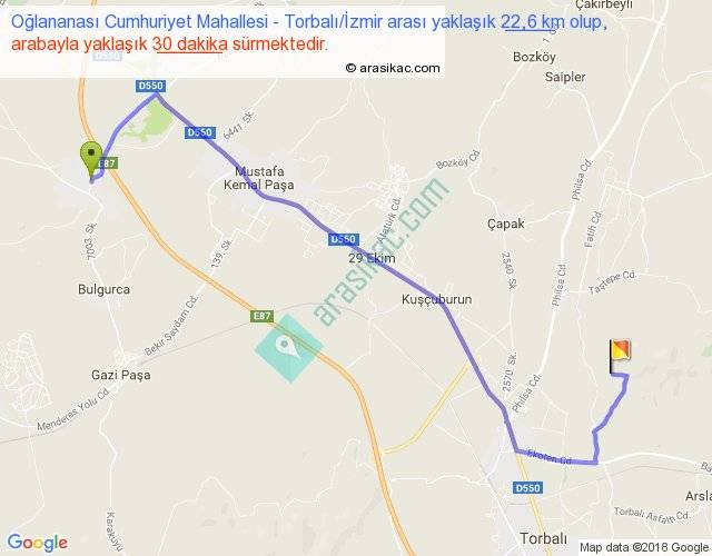 Oğlananası Cumhuriyet Mahallesi - Torbalı İzmir arası yaklaşık olarak 90 km/h ile yukarıda belirtilen sürede olup, iki yerin kuş uçuşu uzaklığı (mesafesi) 15'dir. Yolculuk otobüsle 39 dakika sürmektedir.