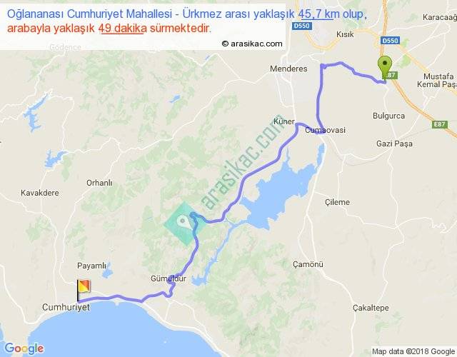 Oğlananası Cumhuriyet Mahallesi - Ürkmez arası yaklaşık olarak 90 km/h ile yukarıda belirtilen sürede olup, iki yerin kuş uçuşu uzaklığı (mesafesi) 32'dir. Yolculuk otobüsle 1 saat 3 dakika sürmektedir.