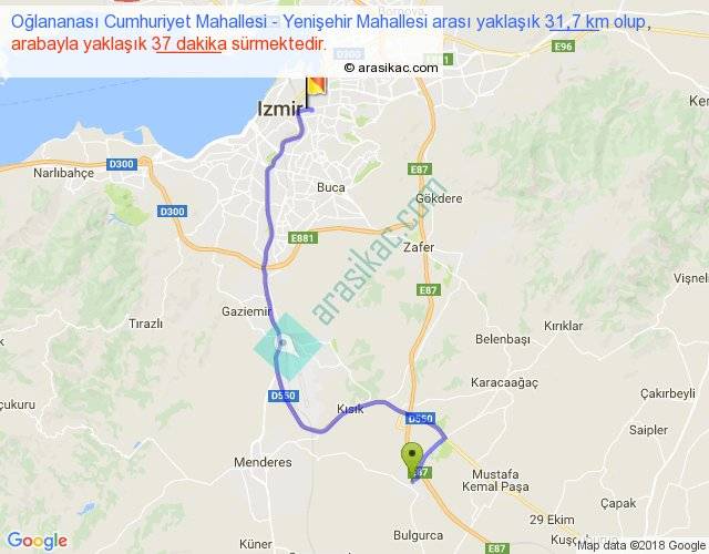 Oğlananası Cumhuriyet Mahallesi - Yenişehir Mahallesi arası yaklaşık olarak 90 km/h ile yukarıda belirtilen sürede olup, iki yerin kuş uçuşu uzaklığı (mesafesi) 21'dir. Yolculuk otobüsle 48 dakika sürmektedir.