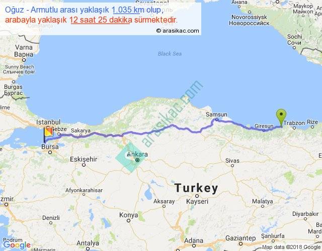 Oğuz - Armutlu arası yaklaşık olarak 90 km/h ile yukarıda belirtilen sürede olup, iki yerin kuş uçuşu uzaklığı (mesafesi) 866'dir. Eğer belirtilen yerler arasında uçak seferi var ise bu süre uçakla 1 saat 19 dakika'ya kadar düşebilir. Yolculuk otobüsle 16 saat 8 dakika sürmektedir.