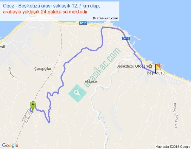 Oğuz - Beşikdüzü arası yaklaşık olarak 90 km/h ile yukarıda belirtilen sürede olup, iki yerin kuş uçuşu uzaklığı (mesafesi) 6'dir. Yolculuk otobüsle 31 dakika sürmektedir.
