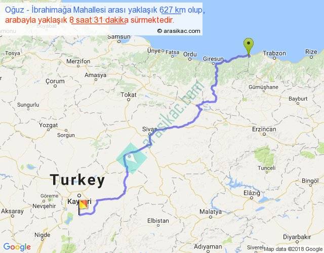 Oğuz - İbrahimağa Mahallesi arası yaklaşık olarak 90 km/h ile yukarıda belirtilen sürede olup, iki yerin kuş uçuşu uzaklığı (mesafesi) 428'dir. Eğer belirtilen yerler arasında uçak seferi var ise bu süre uçakla 39 dakika'ya kadar düşebilir. Yolculuk otobüsle 11 saat 4 dakika sürmektedir.