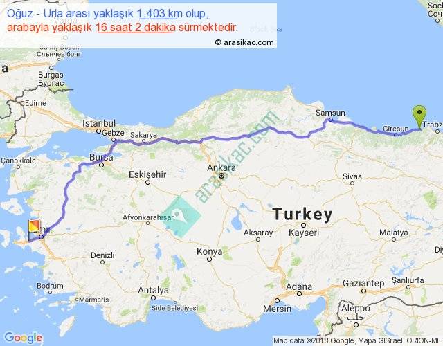 Oğuz - Urla arası yaklaşık olarak 90 km/h ile yukarıda belirtilen sürede olup, iki yerin kuş uçuşu uzaklığı (mesafesi) 1095'dir. Eğer belirtilen yerler arasında uçak seferi var ise bu süre uçakla 1 saat 41 dakika'ya kadar düşebilir. Yolculuk otobüsle 20 saat 50 dakika sürmektedir.
