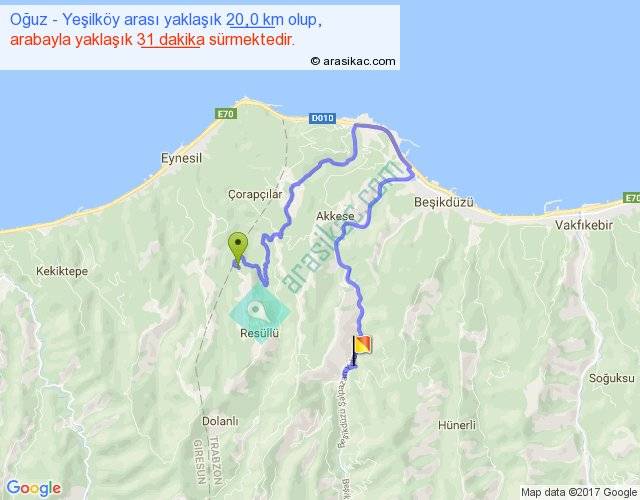 Oğuz - Yeşilköy arası yaklaşık olarak 90 km/h ile yukarıda belirtilen sürede olup, iki yerin kuş uçuşu uzaklığı (mesafesi) 4'dir. Yolculuk otobüsle 40 dakika sürmektedir.