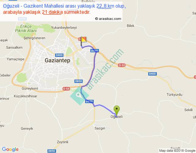 Oğuzeli - Gazikent Mahallesi arası yaklaşık olarak 90 km/h ile yukarıda belirtilen sürede olup, iki yerin kuş uçuşu uzaklığı (mesafesi) 16'dir. Yolculuk otobüsle 27 dakika sürmektedir.