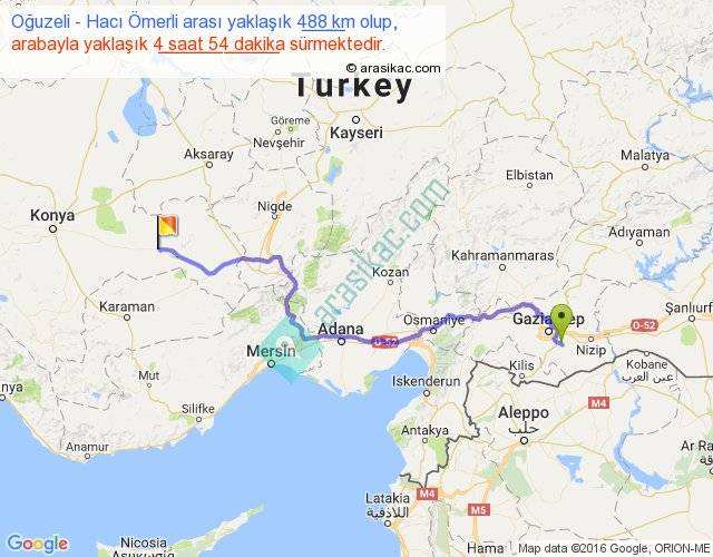 Oğuzeli - Hacı Ömerli arası yaklaşık olarak 90 km/h ile yukarıda belirtilen sürede olup, iki yerin kuş uçuşu uzaklığı (mesafesi) 358'dir. Eğer belirtilen yerler arasında uçak seferi var ise bu süre uçakla 33 dakika'ya kadar düşebilir. Yolculuk otobüsle 6 saat 22 dakika sürmektedir.