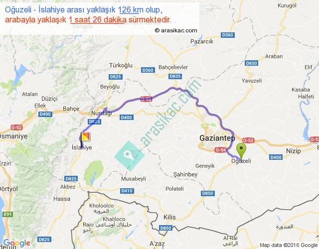 Oğuzeli - İslahiye arası yaklaşık olarak 90 km/h ile yukarıda belirtilen sürede olup, iki yerin kuş uçuşu uzaklığı (mesafesi) 78'dir. Yolculuk otobüsle 1 saat 51 dakika sürmektedir.