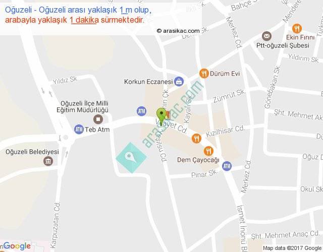 Oğuzeli - Oğuzeli arası yaklaşık olarak 90 km/h ile yukarıda belirtilen sürede olup, iki yerin kuş uçuşu uzaklığı (mesafesi) 0'dir. Yolculuk otobüsle 1 dakika sürmektedir.