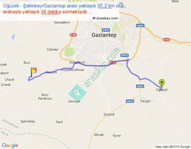 Oğuzeli - Şahinbey Gaziantep arası yaklaşık olarak 90 km/h ile yukarıda belirtilen sürede olup, iki yerin kuş uçuşu uzaklığı (mesafesi) 27'dir. Yolculuk otobüsle 46 dakika sürmektedir.