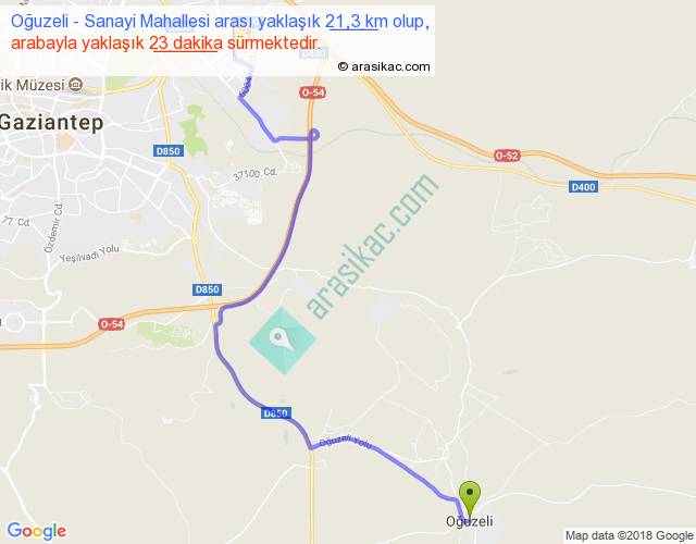 Oğuzeli - Sanayi Mahallesi arası yaklaşık olarak 90 km/h ile yukarıda belirtilen sürede olup, iki yerin kuş uçuşu uzaklığı (mesafesi) 14'dir. Yolculuk otobüsle 29 dakika sürmektedir.