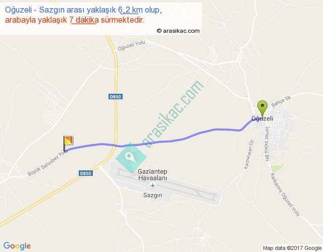 Oğuzeli - Sazgın arası yaklaşık olarak 90 km/h ile yukarıda belirtilen sürede olup, iki yerin kuş uçuşu uzaklığı (mesafesi) 6'dir. Yolculuk otobüsle 9 dakika sürmektedir.