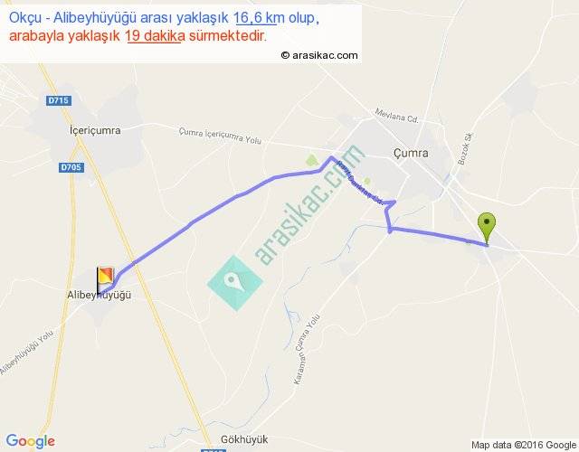 Okçu - Alibeyhüyüğü arası yaklaşık olarak 90 km/h ile yukarıda belirtilen sürede olup, iki yerin kuş uçuşu uzaklığı (mesafesi) 13'dir. Yolculuk otobüsle 24 dakika sürmektedir.