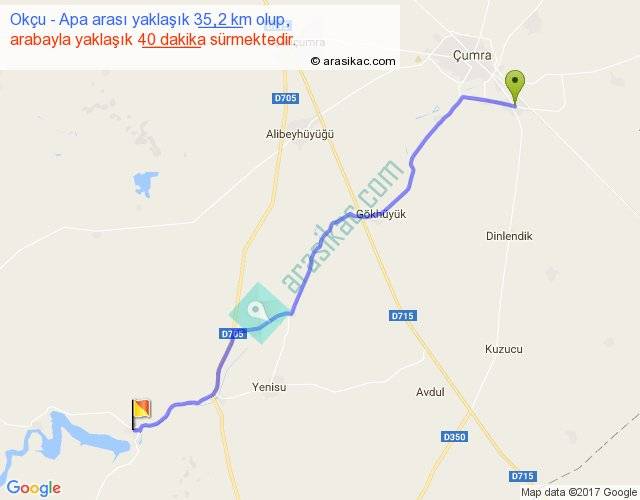 Okçu - Apa arası yaklaşık olarak 90 km/h ile yukarıda belirtilen sürede olup, iki yerin kuş uçuşu uzaklığı (mesafesi) 30'dir. Yolculuk otobüsle 52 dakika sürmektedir.