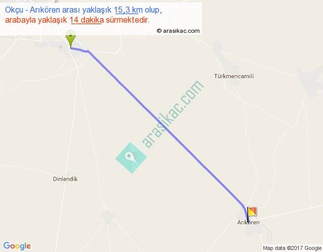 Okçu - Arıkören arası yaklaşık olarak 90 km/h ile yukarıda belirtilen sürede olup, iki yerin kuş uçuşu uzaklığı (mesafesi) 15'dir. Yolculuk otobüsle 18 dakika sürmektedir.