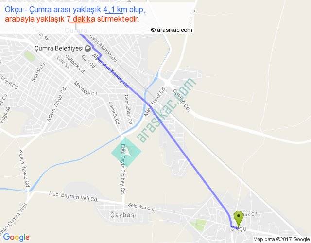 Okçu - Çumra arası yaklaşık olarak 90 km/h ile yukarıda belirtilen sürede olup, iki yerin kuş uçuşu uzaklığı (mesafesi) 4'dir. Yolculuk otobüsle 9 dakika sürmektedir.