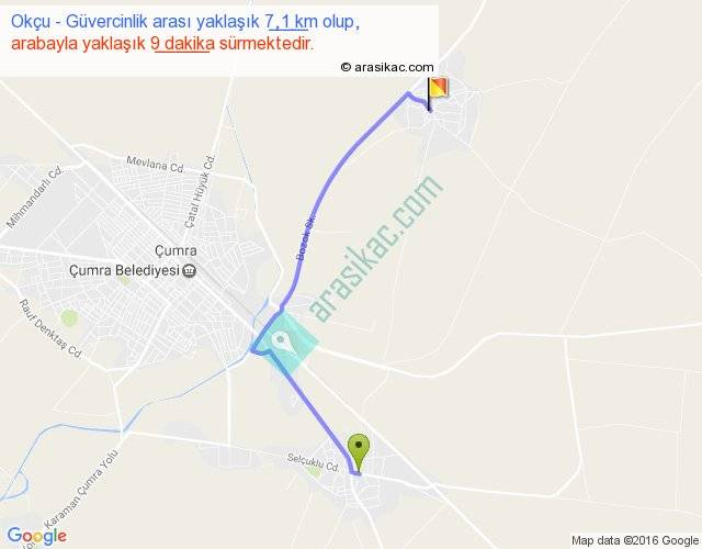 Okçu - Güvercinlik arası yaklaşık olarak 90 km/h ile yukarıda belirtilen sürede olup, iki yerin kuş uçuşu uzaklığı (mesafesi) 5'dir. Yolculuk otobüsle 11 dakika sürmektedir.