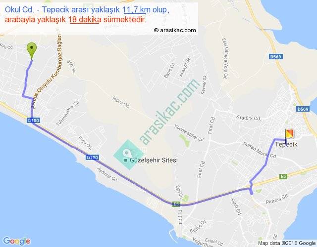 Okul Cd. - Tepecik arası yaklaşık olarak 90 km/h ile yukarıda belirtilen sürede olup, iki yerin kuş uçuşu uzaklığı (mesafesi) 8'dir. Yolculuk otobüsle 23 dakika sürmektedir.