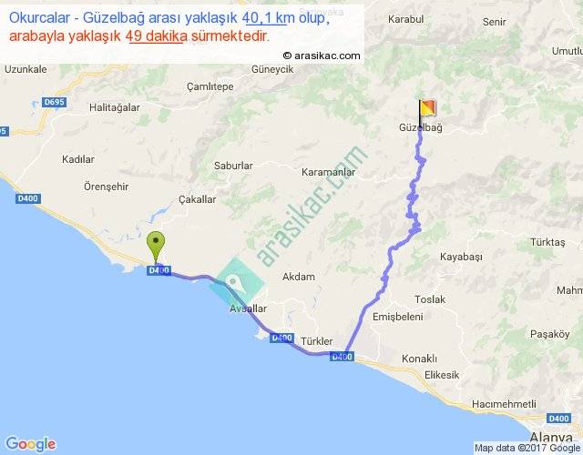 Okurcalar - Güzelbağ arası yaklaşık olarak 90 km/h ile yukarıda belirtilen sürede olup, iki yerin kuş uçuşu uzaklığı (mesafesi) 20'dir. Yolculuk otobüsle 1 saat 3 dakika sürmektedir.