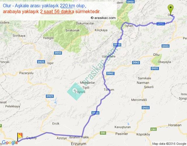 Olur - Aşkale arası yaklaşık olarak 90 km/h ile yukarıda belirtilen sürede olup, iki yerin kuş uçuşu uzaklığı (mesafesi) 157'dir. Yolculuk otobüsle 3 saat 48 dakika sürmektedir.