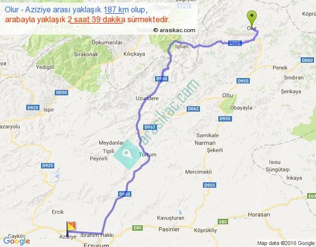 Olur - Aziziye arası yaklaşık olarak 90 km/h ile yukarıda belirtilen sürede olup, iki yerin kuş uçuşu uzaklığı (mesafesi) 130'dir. Yolculuk otobüsle 3 saat 26 dakika sürmektedir.