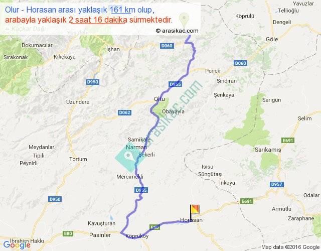 Olur - Horasan arası yaklaşık olarak 90 km/h ile yukarıda belirtilen sürede olup, iki yerin kuş uçuşu uzaklığı (mesafesi) 87'dir. Yolculuk otobüsle 2 saat 56 dakika sürmektedir.