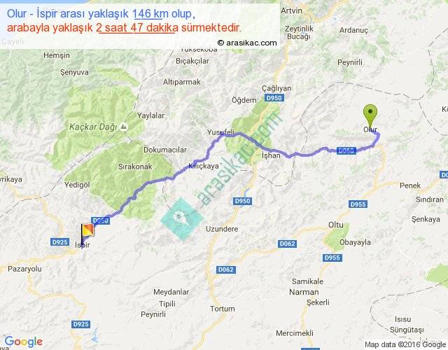 Olur - İspir arası yaklaşık olarak 90 km/h ile yukarıda belirtilen sürede olup, iki yerin kuş uçuşu uzaklığı (mesafesi) 102'dir. Yolculuk otobüsle 3 saat 37 dakika sürmektedir.