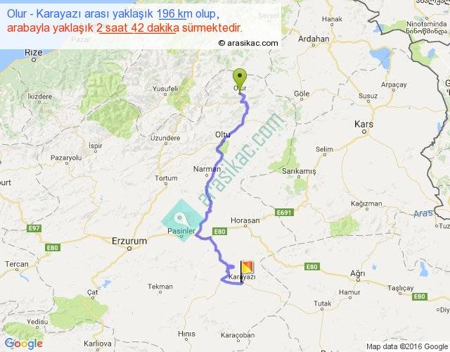 Olur - Karayazı arası yaklaşık olarak 90 km/h ile yukarıda belirtilen sürede olup, iki yerin kuş uçuşu uzaklığı (mesafesi) 124'dir. Yolculuk otobüsle 3 saat 30 dakika sürmektedir.