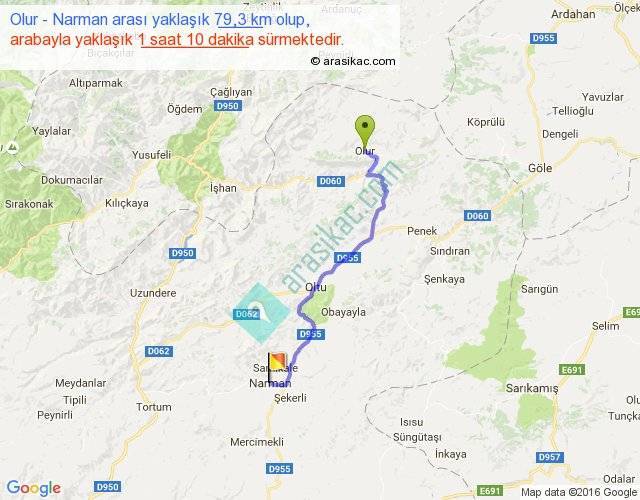Olur - Narman arası yaklaşık olarak 90 km/h ile yukarıda belirtilen sürede olup, iki yerin kuş uçuşu uzaklığı (mesafesi) 58'dir. Yolculuk otobüsle 1 saat 31 dakika sürmektedir.