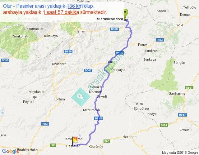 Olur - Pasinler arası yaklaşık olarak 90 km/h ile yukarıda belirtilen sürede olup, iki yerin kuş uçuşu uzaklığı (mesafesi) 102'dir. Yolculuk otobüsle 2 saat 32 dakika sürmektedir.