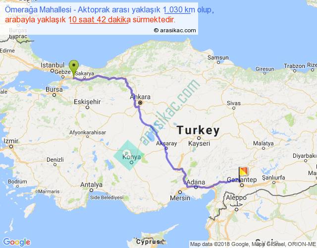 Ömerağa Mahallesi - Aktoprak arası yaklaşık olarak 90 km/h ile yukarıda belirtilen sürede olup, iki yerin kuş uçuşu uzaklığı (mesafesi) 745'dir. Eğer belirtilen yerler arasında uçak seferi var ise bu süre uçakla 1 saat 08 dakika'ya kadar düşebilir. Yolculuk otobüsle 13 saat 54 dakika sürmektedir.