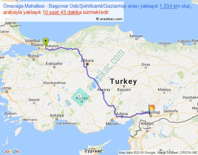 Ömerağa Mahallesi - Başpınar Osb Şehitkamil Gaziantep arası yaklaşık olarak 90 km/h ile yukarıda belirtilen sürede olup, iki yerin kuş uçuşu uzaklığı (mesafesi) 748'dir. Eğer belirtilen yerler arasında uçak seferi var ise bu süre uçakla 1 saat 09 dakika'ya kadar düşebilir. Yolculuk otobüsle 13 saat 58 dakika sürmektedir.