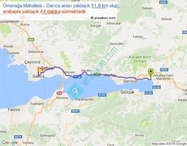 Ömerağa Mahallesi - Darıca arası yaklaşık olarak 90 km/h ile yukarıda belirtilen sürede olup, iki yerin kuş uçuşu uzaklığı (mesafesi) 44'dir. Yolculuk otobüsle 57 dakika sürmektedir.