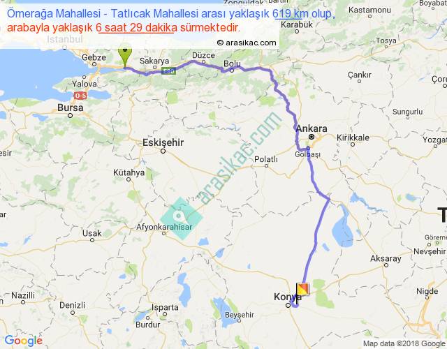 Ömerağa Mahallesi - Tatlıcak Mahallesi arası yaklaşık olarak 90 km/h ile yukarıda belirtilen sürede olup, iki yerin kuş uçuşu uzaklığı (mesafesi) 394'dir. Eğer belirtilen yerler arasında uçak seferi var ise bu süre uçakla 36 dakika'ya kadar düşebilir. Yolculuk otobüsle 8 saat 25 dakika sürmektedir.
