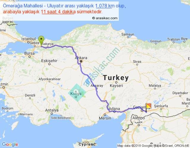 Ömerağa Mahallesi - Uluyatır arası yaklaşık olarak 90 km/h ile yukarıda belirtilen sürede olup, iki yerin kuş uçuşu uzaklığı (mesafesi) 789'dir. Eğer belirtilen yerler arasında uçak seferi var ise bu süre uçakla 1 saat 12 dakika'ya kadar düşebilir. Yolculuk otobüsle 14 saat 23 dakika sürmektedir.